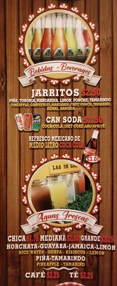 Pineapple, grapefruit, mandarin, fruit punch, tamarind, sidral, or sangria. Pina, toronja, mandarina, limón, ponche, tamarindo, sidral, sangria.